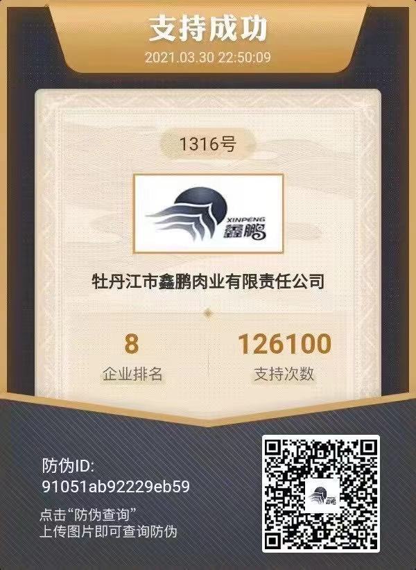 牡丹江市鑫鵬肉業(yè)有限責(zé)任公司參加黑龍江省屠宰行業(yè)誠信企業(yè)評(píng)選名列第八!鑫鵬肉業(yè)從籍籍無名到躍升問鼎,取得這份榮譽(yù),是我們共同堅(jiān)持不懈、同心同德的結(jié)果!感謝全體鑫鵬人的齊心努力!感謝摯愛親朋的鼎力協(xié)助!鑫鵬人一定不負(fù)眾望,以更好更優(yōu)質(zhì)的產(chǎn)品回饋家鄉(xiāng)!回饋社會(huì)!